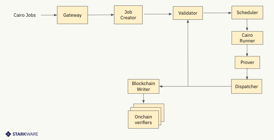 - The Dispatcher, which either packages proofs before sending them onchain, or verifies them using the Cairo verifier, creates a corresponding recursive job, and sends it back to the validator