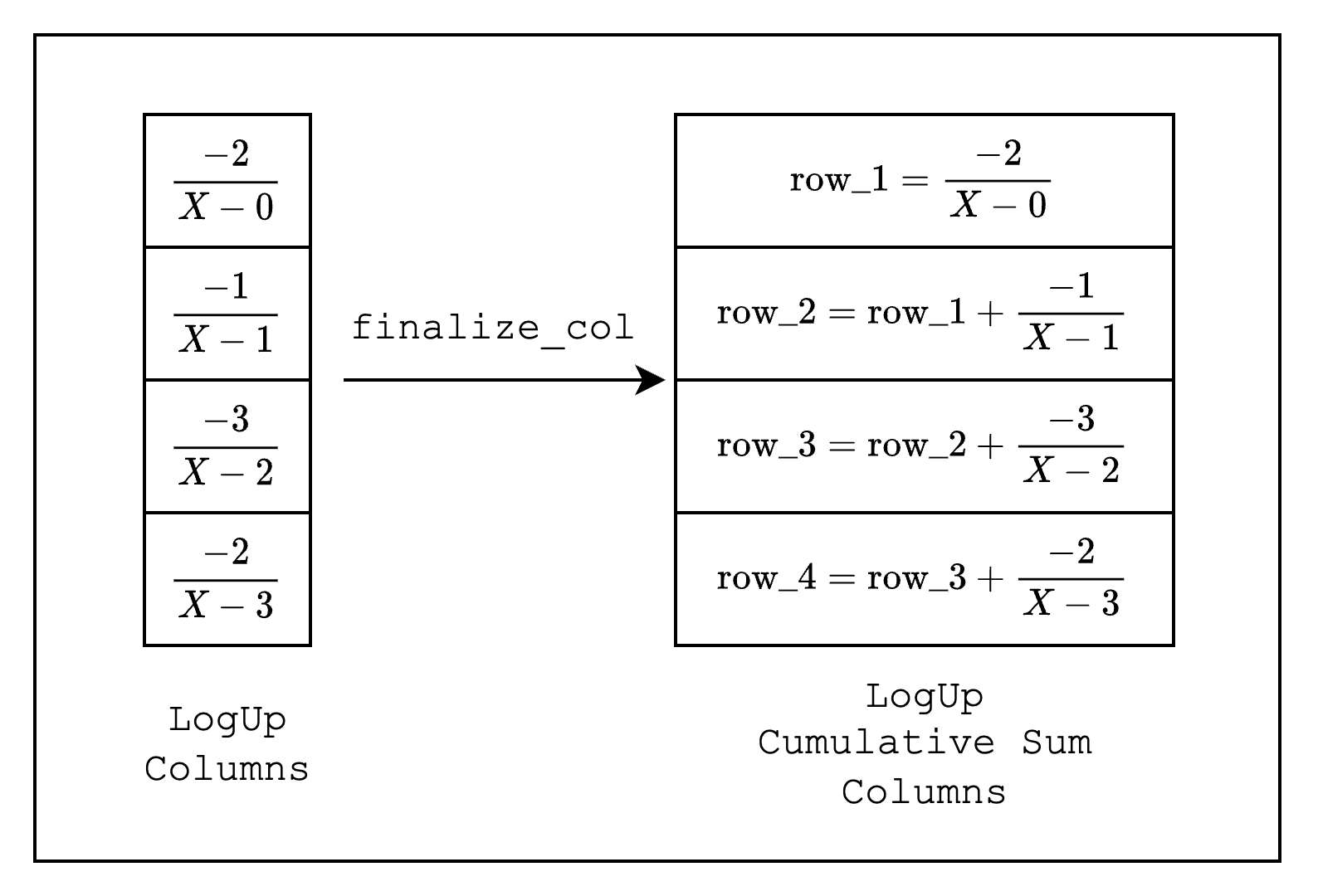This process modifies the LogUp columns from individual fractions to cumulative sums of the fractions as shown in Figure 2.